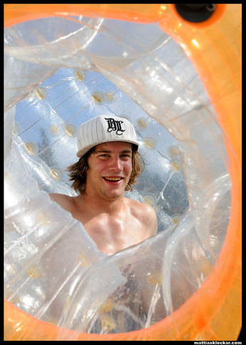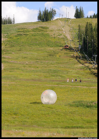 Självklart var man tvungen att prova, men att åka själv kändes inte riktigt hundra så jag bad Nisse Örnjäger om sällskap för att bygga mer fart och tydligen större risk att slå sig. Full fart utöver backen och en grop senare som sätter bollen ur spel, lite airtime, och att landa med ryggen på plugg kudden till entré hålet i bollen gör att det börjar vobbla och studs åt alla hål och kanter samtidigt som vattnet blir mindre och mindre i bollen för varje varv som snurras. Och jag och Nisse studsar runt och slår i varandra för fulla muggar. Tills vi stannar efter att farten dött ut på den plana marken och vi hittar ut i verkligheten med ett stort leende och garv på läpparna.