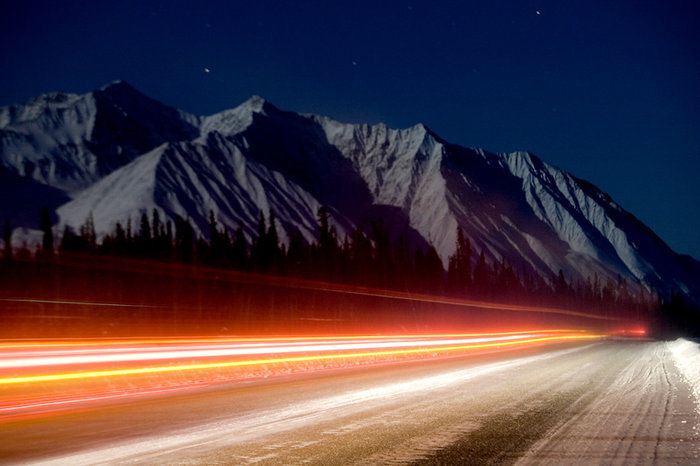 När vi stannade för att ta den här bilden hade vi kört i 60 timmar eller mer från Vancouver. Det var en av de kallaste nätterna jag kan komma ihåg. När jag höll på att fixa med stativet och kameran frös mina fingrar så snabbt att det var svårt att fixa inställningarna på kameran men det vara bara att bita ihop för att ta vara på det fina månljuset.