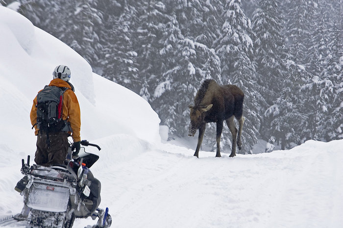 Vi var inte de enda som använde skoterleder till våra pillowåk. Snödjupet gjorde det väldigt svårt för älgarna att ta sig fram så vi träffade på dom ganska ofta på de hårdpackade skoterspåren. Vi körde sakta mot älgen men den visade tillslut vem det var som bestämde på denna leden. Här är det Stephan Drake som fattade vinken och lät älgen göra sitt.