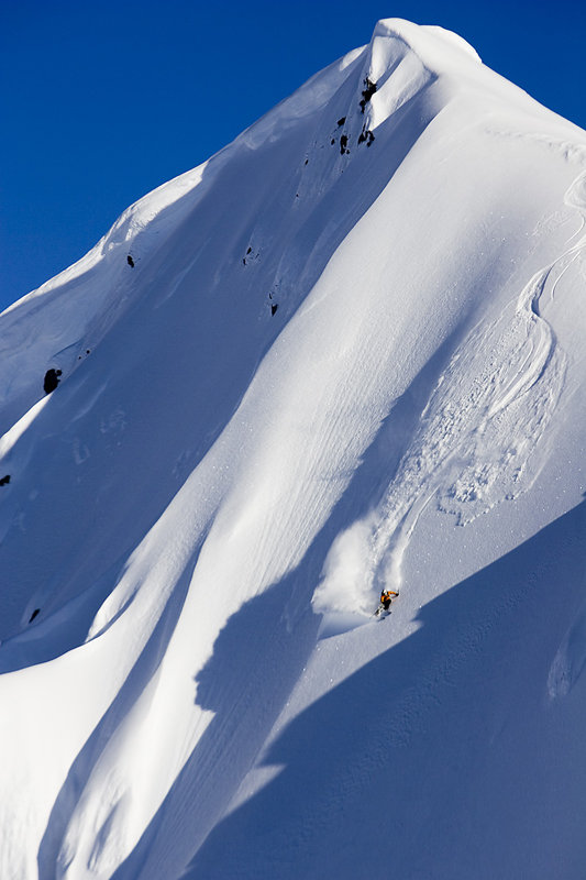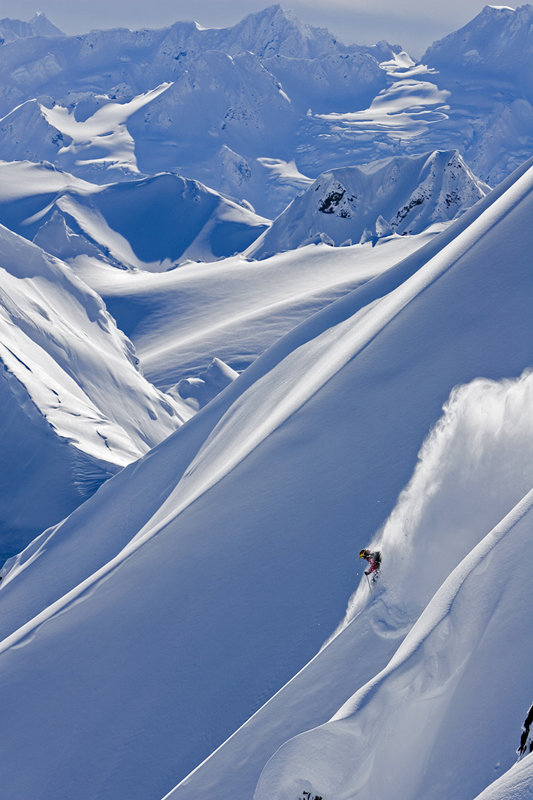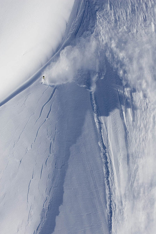Han är en av de mest erfarna och ödmjukaste åkarna jag fotat i Alaska och han vet vad han gör. Jag kommer ihåg han säga på radion: ”Det kommer med 99% säkerhet släppa men jag vet exakt var jag ska åka och har en säker plan”. Precis som han sa släppte det men hans plan funkade till 100%. Han började med att köra rätt ner i fallinjen för att få fart att skära av det första hängande fältet. Han höll sig hela tiden till skiers höger under drivan och skar av del för del.