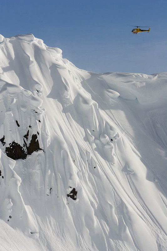 För två säsonger sedan flög jag och Mark in till en zon som heter Too Short med Sebastian Garhammer och Jon Larsson och blev avbrutna två gånger av hängdrivor som gav vika. Under vårt första försök förlorade vi nästan vår vän och guide Rob Liberman. Han höll på att leta efter en säker väg in till Jons åk när en hängdriva stor som ett hus rasade. När all snörök hade lagt sig såg vi att drivan tagit med sig all snö på hela bergsidan där Jon skulle åka och Rob var borta.