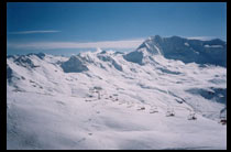 Hur som helst så anlände vi till byn vid lunchtid på söndag morgonen och eftersom fransmännen har för vana att lägga ner all verksamhet, affärer m.m, för ett par timmar mitt på dagen så fick vi snällt vänta till klockan tre innan vi fick tillgång till hotellrummet. Hotellet vi bodde på i år heter Chalet Club och är en ganska anspråkslös anläggning men helt klart godkänd. Rummen är små och trånga men billiga. På måndag morgon gick reväljen vid sju och det var dags för en stadig frukost, utanför låg molnen låga och tjocka och innan klockan åtta är redan liftköerna långa till bergståget som öppnar först halv nio. Väl uppe på Grande Motte var det full kalabalik och dom befarade landslagen hade satt upp fullt med portar i pisterna så det gäller att hålla sig borta från dom. Det kändes otroligt skönt att återigen få känna den kalla snön glida under belaget. Vid 14.45 stänger liftarna igen och det är till att ta bergståget ner till byn igen. Följande dag hade molntäcket lättat något och snön vräkte ner, men vi slapp i alla fall flatljuset. Vädret var ungefär detsamma under den resterande delen av veckan, men på lördags morgonen hade himlen spruckit upp och solen välkomnade oss till en ny dag som genast fylldes av förväntningar, och uppe på glaciären uppfylldes alla förväntningar, under natten hade ett 35-40 cm tjockt täcke av nysnö bäddat in berget och vi lekte oss igenom dagen. Lördagen var även den ofrånkomliga avresedagen och vi lämnade Tignes med trötta ben och ett stort leende på läpparna och jag tror att hela sällskapet var överens om att Tignes är en riktig pärla vid den här tiden på året som man gärna återkommer till …