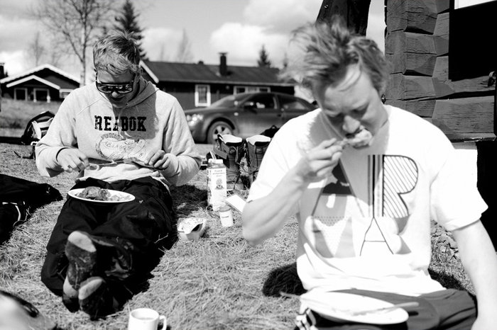 I en röd stuga sitter vi och väntar på att skymningen ska närma sig, alla är lite trötta och sega efter en lång dag i backen. Nu väntar vi på att solen ska drunkna bakom horisonten och himlen slå upp i lågor. Så här är det. Många timmars väntan. Mycket tid att för driva. Allt för ofta handlar en resa om att fördriva tid. Är det mulet eller om det till och med regnar kan det handla om att fördriva hela dagen, eller kanske till och med flera dagar i följd. Runt det fyrkantiga vardagsrumsbordet går timme efter timme och här sitter gubbarna och kidzen i samma soffa. Gubbarna som skaffat skägg och vuxit upp, kidsen som knappt fått moppe mustach och är nu på väg att föra vidare fanan. När Ilis pluggat klart och fastnat på ett kontor och Rosengren flyttat till Hollywood. Nu är det kidzens tid att växa upp och ta över.