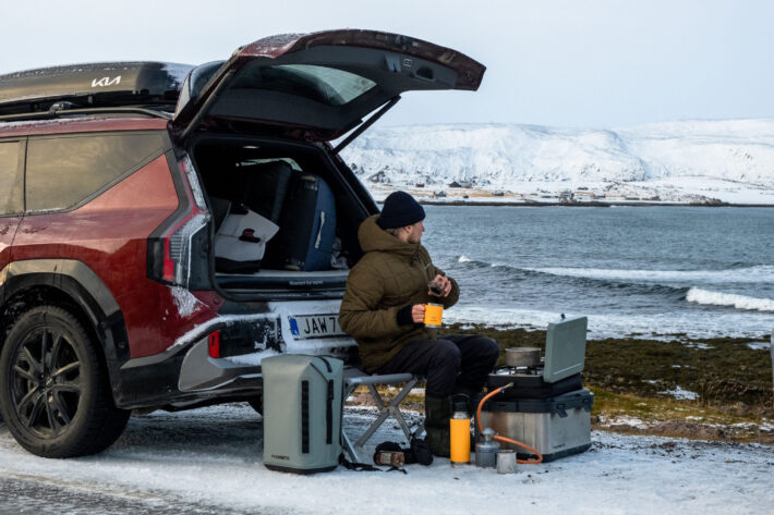 – Kia EV9 är oerhört anpassad för att bo i. Den är väldigt stor, rymmer mycket och tar sig fram överallt. Det finns en skräddarsydd madrass för bilen som man ligger bekvämt på. Kias klimatanläggning är också otroligt bra, det går att ställa in exempelvis 20 grader och det drar knappt någon ström. Det finns lampor överallt och allt går att styra enskilt med en app. Bakluckan går också att öppna inifrån och det finns 220v-uttag i bilen så du kan ladda telefon och dator samt använda elplattor och vattenkokare. Massagestolen är inte så dum heller, haha.