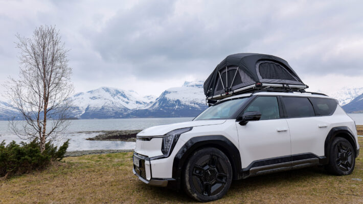– Jag och Kia EV9 har tuffat runt på Haglöfs filmfestival hela hösten där vi visade vår film ”Sarek”. Vi har betat av ganska många mil… Stockholm, Göteborg, Oslo. Bilen har också varit en del av programmet under filmturnén, vi har serverat kaffe via Vehicle-2-Load från bagageluckan och den har varit utrustad med samma set up med taktält som i våras i Riksgränsen och Norge när jag min vän Adam Müller bodde i bilen i två veckor.