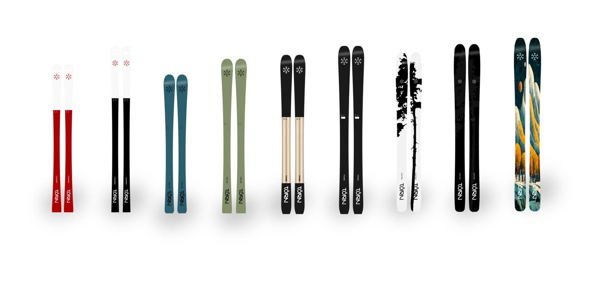 Vi spanar in modellerna som sträcker sig vitt och brett från smala raceskidor till breda puderplankor. Totalt har Törn Skis sex olika modeller som vi presenterar kortfattat nedan: