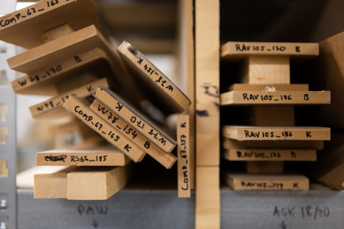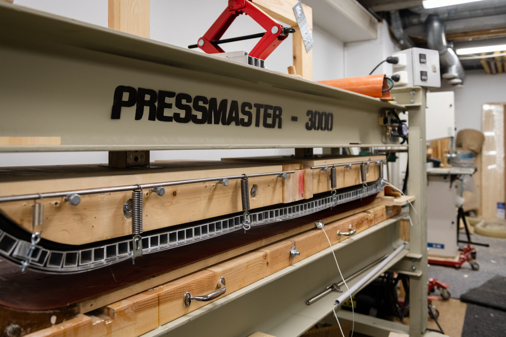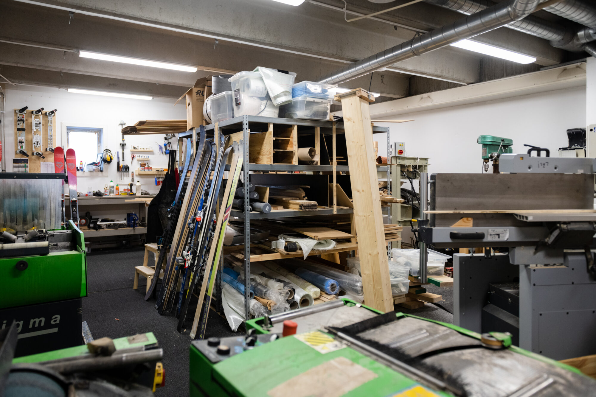Vi tar oss vidare från entrén in i själva verkstaden där skidorna konstrueras. Jan går pedagogiskt igenom varje steg i tillverkningsprocessen. Från det att träkärnan sågas till det att skidorna pressas och slutligen får en välpolerad finish.