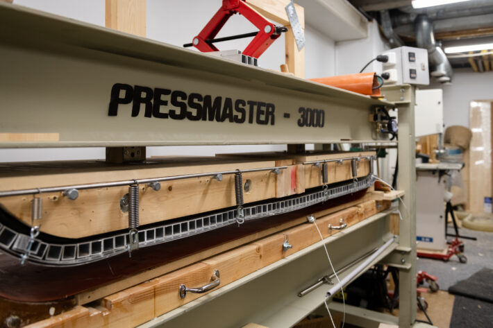 Skidorna främre del förses med gummi innan de sätts under press för att materialen ska sammanfalla till det som så småningom ska bli ett par skidor. Slutresultatet ser ut som vilka skidor som helst – bortsett från en detalj…