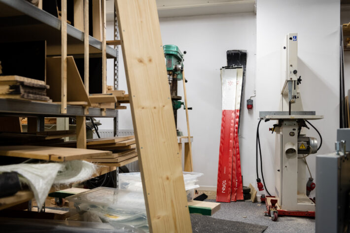 Därför blir vi väldigt förvånad när Jan Persson öppnar upp portarna till Gävle Skidfabrik och det första som möter blicken är en reception och ett showroom där skidmodellerna står prydligt uppradade och punktbelysta med spotlights.