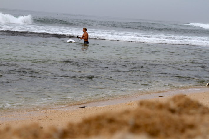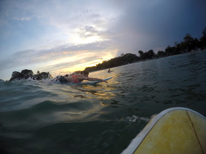 Vi står i knädjupt vatten och ser hur vågorna bryter kraftfullt framför oss. Vi är på surfstranden SK Town fortfarande. Vårt sikte är line up:en utanför det vita, vilda skummet av vågor som bryter här inne. Vi hoppar över skummet, som blir av vågorna här inne, och landar med magen på brädan. Sedan kommer en platt lucka i vattnet. Fältet är fritt.