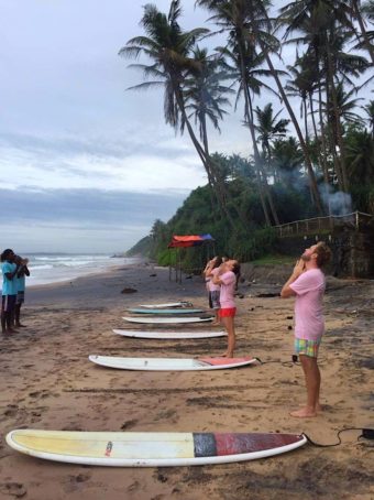 Det varma & salta havsvattnet sköljer bort all sand på mage och lår, som satt sig efter paddlandet i sanden. Leahsen runt smalbenet känns i början, men sitter efter en stund bara obemärkt på. Vi tar oss ut och vår coach Randika hjälper oss en och en, säger åt oss att paddla, står vid sidan och ger en knuff när vågen kommer och så ”stand up”. Även coachen Nalindu hjälper till. Upp på brädan och vi fem som kör trillar, står, trillar igen, står lite längre, svär, tjoar, blir förbannade, skrattar och försöker om och om igen.