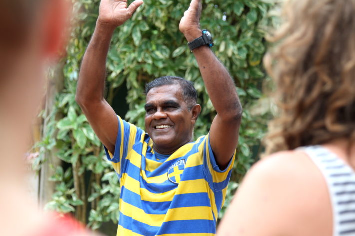 För det blir inte en gång till. Vi kör 7-8 gånger till, minst, och han hjälper oss med detaljerna ”längre fram med benet, du måste stå på linjen annars kommer brädan att välta i vattnet, snabbare upp annars hinner brädan dyka ned i vågen som hinner att bli för brant”. ”Är detta verkligen kul?” tänker jag och skickar menande blickar i riktning mot mannen som bär ansvar för att vi allesammans hamnat här på surfstranden SK Town utanför staden Matara på södra Sri Lanka. Mannen heter Adam Widén.