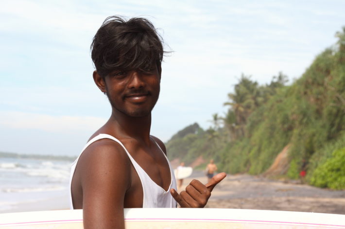 På södra Sri Lanka är klockan 8 på morgonen. Temperaturen i luften är runt 25 grader Celsius och Indiska oceanens vågor som rullar in mot stranden håller en temperatur på drygt 29 grader. Surfskolan ringer in. Vågmagister Randika Eshan och paddeladjunkt Nalindu är förberedda.