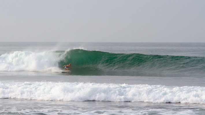 Adam Widén och Janette Hargin verkar urstarka och paddlar iväg framför mig. Det är jobbigt, men det är inte helt dödande för armarna. Långsamt tar jag mig ut mot de gröna, obrutna vågorna. Men en lite större våg möter oss på väg ut till line up:en och den duck-divar jag efter bästa förmåga av det jag lärde mig i Australien för över 15 år sedan. Det är en ganska snäll våg och jag har nog inte tappat mer än 5-7 meter när jag kommer upp ifrån den, sedan är det några stadiga paddeltag till och jag sätter mig upp invid Adam och Janette och andas ut ett slag.