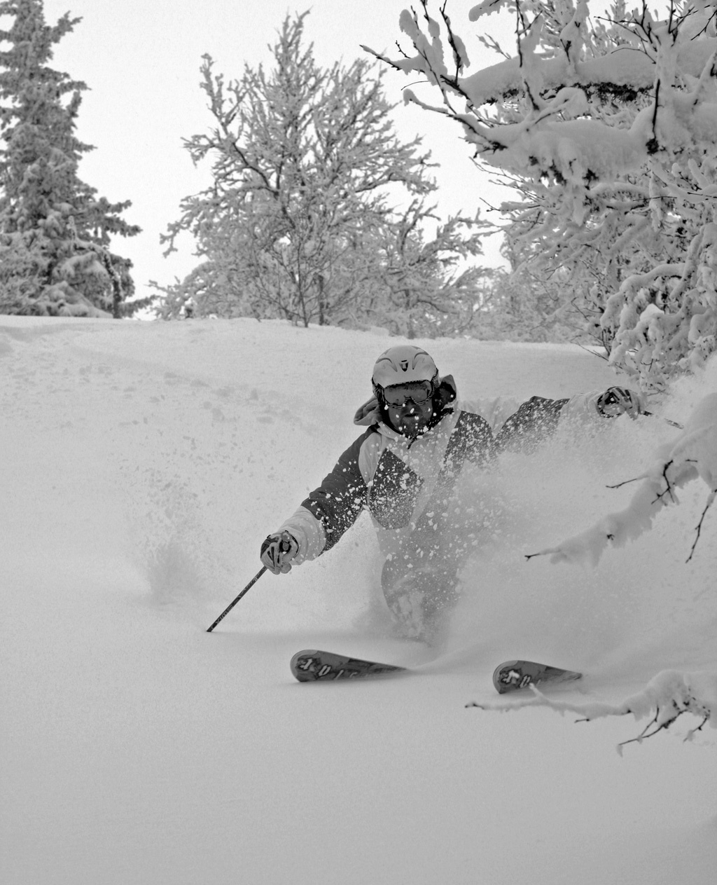 Inne i Kanada Skogen fortsätter vi ut på en transportsträcka, skär tvärs över den och är lika snabbt inne bland granarna igen. Miljön påminner om andra sidan Atlanten – mängder av fint puder, resliga granar och spridda mindre klippartier. Trysil har två bra snöår i rad. Dessa veckor i början av mars 2009 verkar det aldrig sluta falla vita mjuka kristaller från skyn, mätpinnen visar redan en bit över en och en halv meter snö.