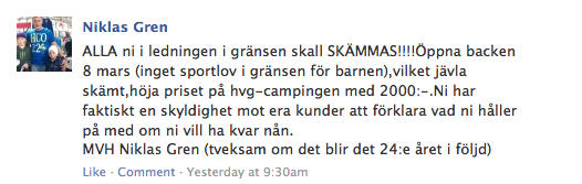 Det var Niklas Grens inlägg (se nedan) som fick fart på åsikterna och inlägget har i nuläget 389 likes och 22 kommenterer, med många syrliga passningar till orten. Kritiken riktade sig framförallt mot Rikgränsens plan att senarelägga säsongspremiären 2012/2013 två veckor (till den 8 mars, reds anm) jämfört med i år samt höjda campingavgifter.