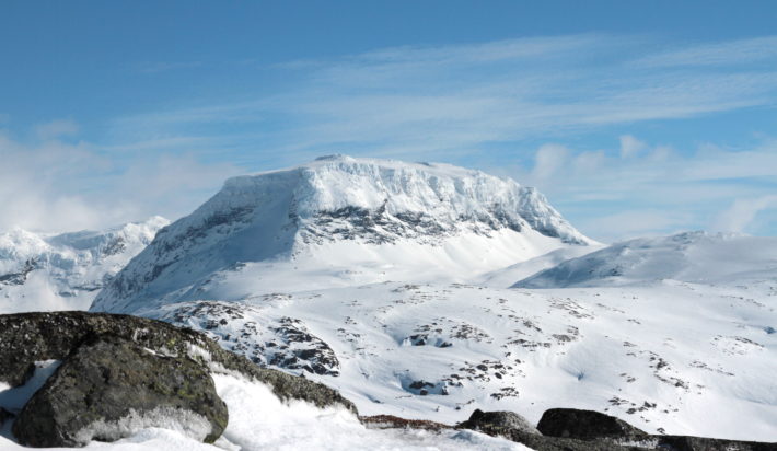 Tillbaka till Nordals går vi upp i ravinen. Det är en lätt hajk. Många har gått före oss och vi nyttjar trappstegen som bildats i snön. Vyn västerut mot Rombakstøtta och topparna kring Narvik är norsk standard, det vill säga fantastisk. På andra sidan gränsen – i vanlig ordning – blir fjällen lite högre, lite brantare, lite vackrare. Flatljuset kommer tillbaka och från toppen av Nordals ser vi inte mycket längre än den lilla statyett som är rest på toppröset till NM-arrangören Robert Gustafssons ära.