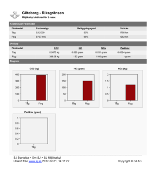 CO2-utsläpp tåg Gbg-Riksgränsen t/r: 0,0075 kg (7,5 gram)