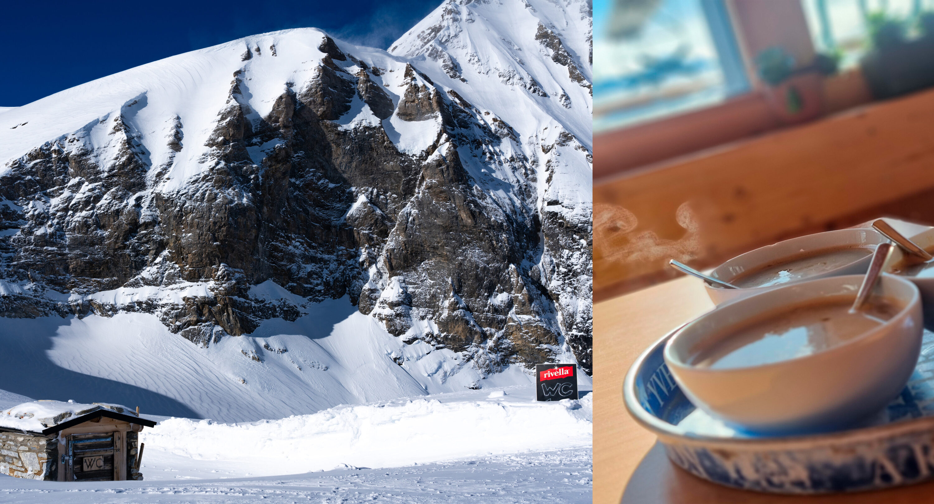 All vår packning som vi inte behöver för turen (rollerbags presterar generellt obra i offpisten) är i transit till vårt nästa resmål efter att vi nått Leukerbad, Les Marécottes. Innan den relativt snälla och behagliga stigningen mot bergskammen in i nästa dal, stannar vi till vid ett obligatoriskt stopp för lokalborna, Lötschenpasshütte. Här hälsar vi på ägarna som är i full fart med att skotta fram stugan innan vi unnar oss en kopp kaffe av episka mått i restaurangen. Ett hett tips från coachen är att ta dig tid att besöka det magnifika utedass innan stighudarna åker på. Om inte för utsikten, så för att magen omöjligen inte rivstartar efter en balja med rivigt svart kaffe.