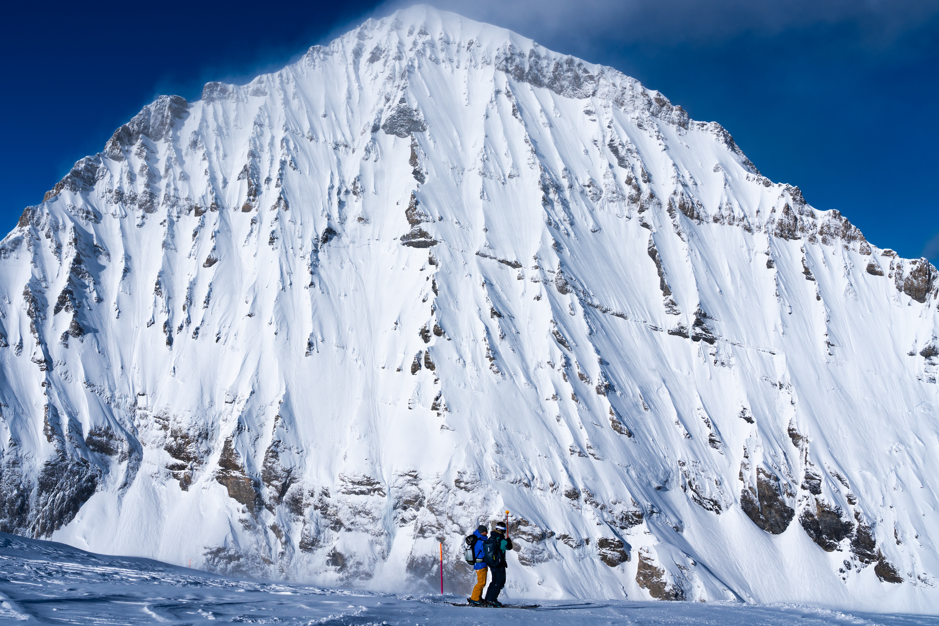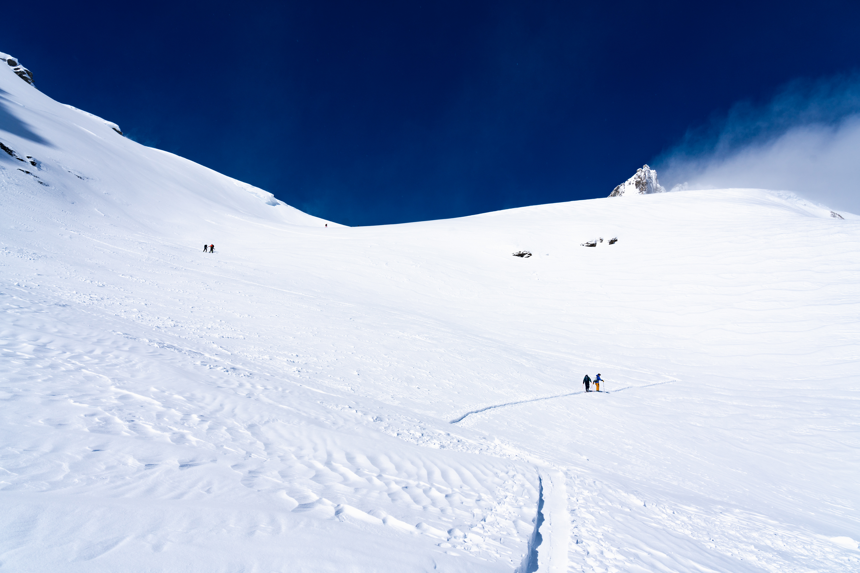 När vi når toppen på Gitzifurggu, som kammen heter, har vi den mäktiga Balmhorn vid vår sida. Bakom oss slänger vi en sista blick på Lötschental, den fantastiska dalen och vår packning som förhopningsvis också är på väg ut ur dalen. Framför oss mot nästa dalgång så breder en enorm bowl sig ut med orörd snö och kuperad terräng som bjuder in till barnsligt rolig skidåkning. De enda spåren som vi ser är från två snowboardåkare som jobbar sig nedåt.