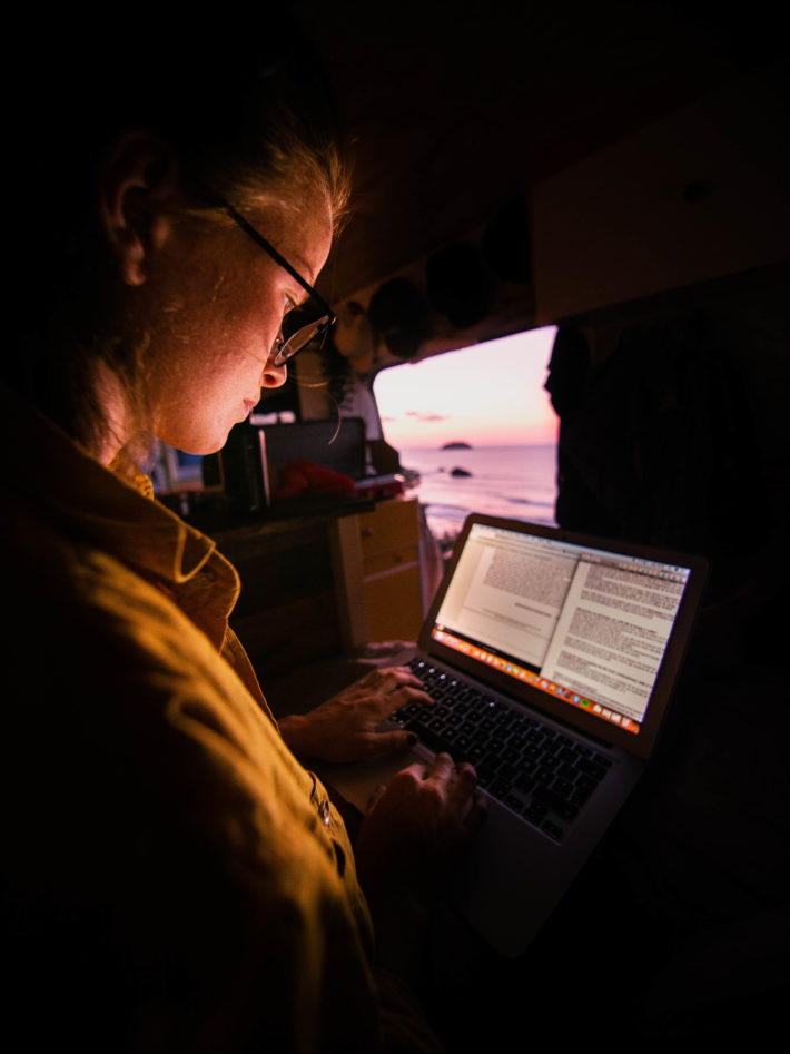 Innan jag börjar styra med frukost öppnar jag sidodörren och kliver rätt ut i naturen. Ett steg utanför mitt hem och jag befinner mig precis där jag vill vara. Gryningen sveper in naturen omkring mig i ett mjukt ljus och mina ögon vilar på det stora blå framför mig. Att få börja min dag på det här sättet är en utav de största belöningarna med att bo i en bil. Jag får somna vid havet varje natt och vakna upp vid havet varje morgon, en rutin som inte är helt fel om du frågar mig.