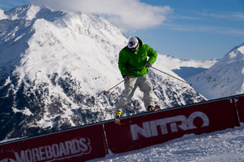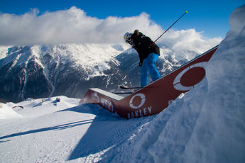 Vi har bestämt träff med Rudi Wyhlidal som är parkdesigner och ansvarig för Swatch Snowpark uppe i Giggijoch. Sölden var tidigt ute med en park redan för 12 år sedan, men för två år sedan inleddes storsatsningen på parken. – Vi satsar mest småjibbs som rails och boxar och inte lika mycket på stora kickar. Alla ska kunna ha kul i parken, både de som inte åkt så mycket och jibbers som hänger här jämt. Senare på säsongerna brukar vi satsa på en riktigt stor photo shoot-kick vid sidan om parken, berättar Rudi och plockar fram sin systemkamera ur ryggsäcken för att fånga två Oakleyåkare som kör i parken under förmiddagen.