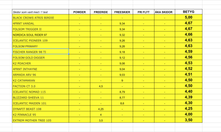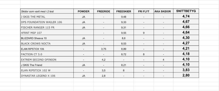 Nej, vi har inte tagit med alla de testade skidorna. Men det är 52 olika modeller, som istället är genomåkta i flera av de olika testen. Om du vill läsa allt om alla skidor så läser du POWDERS skidtest här (69 skidor), du läser FREESKIERS skidtest här (117 skidor) och FRI FLYTS skidtest (62 skidor) kommer du åt via prenumeration av tidningen eller abonnemang på deras egen sajt skitest.com och samma sak gäller för ÅKA SKIDORS skidtest (85 skidor). Freerides (18 skidor) eget skidtest läser du i sin helhet här, eller ser videoinslag från här.