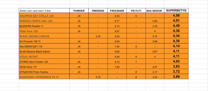 Nedan listar vi alla dessa 52 teståkta skidor, berättar vad det är för typ av skida och vilka som har testat skidan, samt räknar ut betyg, snittbetyg och ”superbetyg”. Betyg redovisar vi för de skidor som enkom varit med i ett av skidtesten, snittbetyg får du på de skidor som har varit med i två tester, och ett så kalla superbetyg får du för de skidor som har varit med i tre test eller fler.