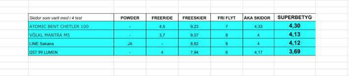 Alla skidor som är med nedan är riktigt vassa tingestar att ha under pjäxorna. Det är kvalitetsskidor hela bunten och, i vanlig ordning, ska skidtest läsas med viss skepsis. Det är en informativ och första bra inblick i skidan, men är långt ifrån någon objektivt verifierbar sanning. Betygssättningen är också ett kapitel för sig, där de olika skidtesten har valt olika vägar framåt. POWDER sticker ut här genom att helt sonika inte sätta betyg, utan hänvisa läsarna till citat och beskrivning av skidorna. Men POWDERS urval av skidor är ändock en kvalitetsstämpel.
