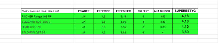 Betygen är omräknade till skalan 1-5, men vi har låtit behålla två decimaler för att få lite mer nyans. Vi har varken gjort påslag eller avdrag i någon av betygsformerna utifrån hur många test som skidan har varit med i. Skidorna är listade efter hur många test de har varit med i, därefter i betygsordning.