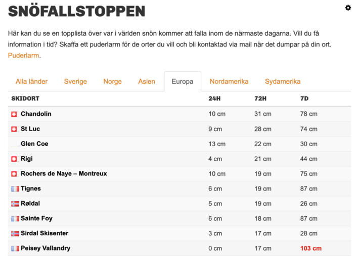 Inom de närmsta dygnen ser det ut som att Schweiz får störst mängd nederbörd. Enligt 7-dagars prognosen på freerides egna snöfallstoppen så får Frankrike också en välbehövlig påfyllning inom en vecka med uppåt en meter snö. Se nedan.