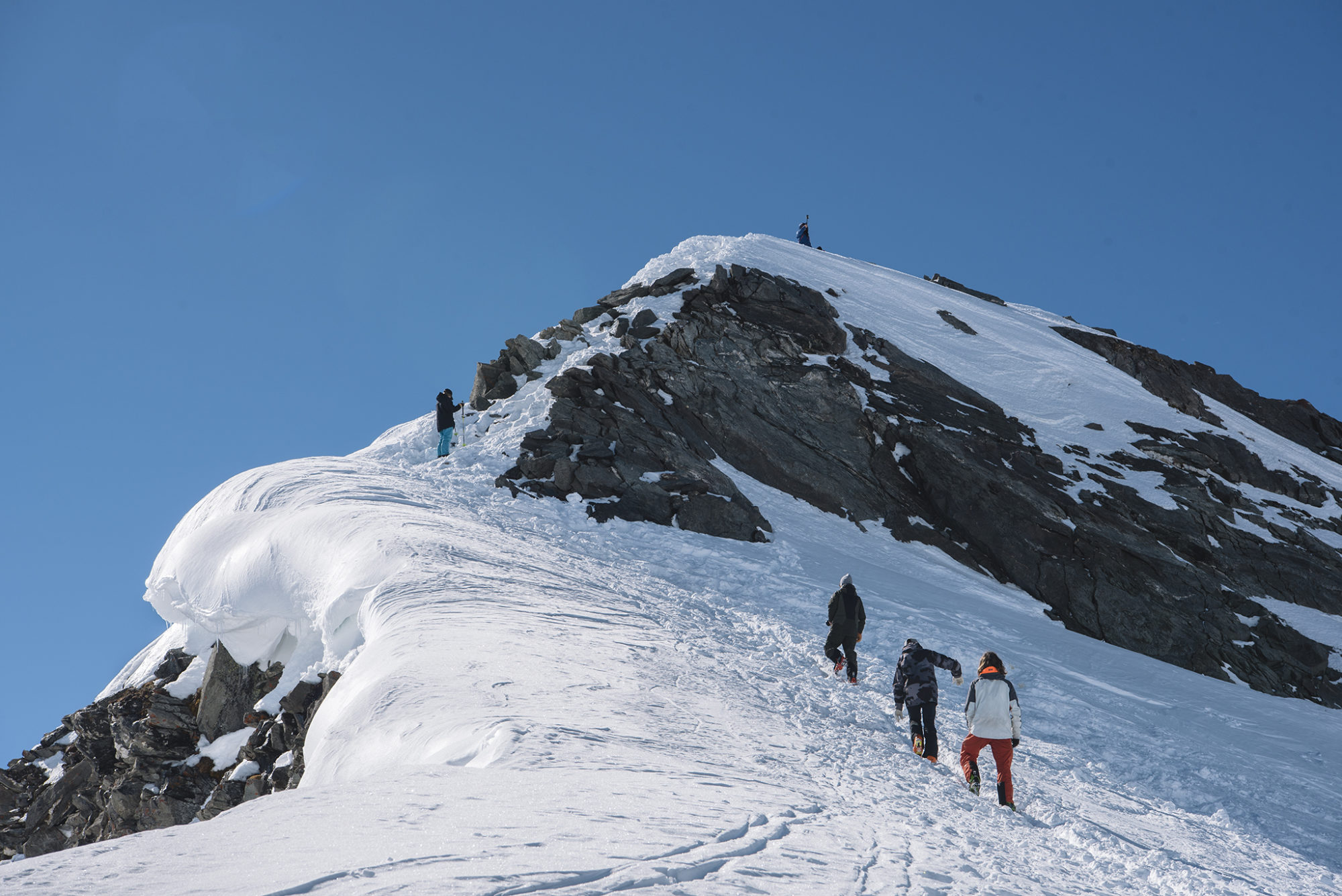 Vi valde den enklaste sidan som går, samma som när man turar upp, ganska flackt men mysigt åk. Men då det inte var den bästa snön så fick det räcka gott och väl. Denna dag forcerade solen verkligen bergen och brännan ökade för varje sekund. Runt lunch så var vi strax under toppen och där tog vi en magisk lunch med en storslagen utsikt över Grand Combin (regionens högsta berg), Mont Blanc samt Matterhorn.