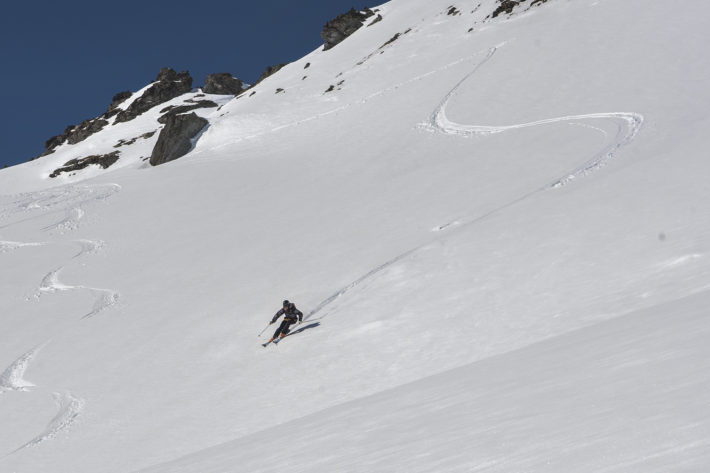 Efter en lunch av kvalité (åtminstone bra nog för en snapchatstory) så började vi glida mot bergssidan vi skulle ge oss ut för. Direkt inser vi att åket vi hade tänkt köra hade åkt iväg av en lavin och ingen av oss var sugen på att harva ner bland miljoner av stenar. Istället skråade vi skiers left och hittade ett nästintill orört fält. Om vi sa att det var kall och fin pudersnö så skulle vi ljuga, men snön var för att inte ha snöat på 10 dagar samt utsatts med vårvärme ändå väldigt bra.