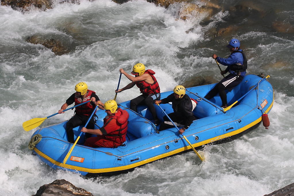 Dags för rafting i Nepal. Vi lämnade hotellet tidig morgon för att åka till Bothi Kosi-älven. Den finns ca 1,5 timmes bilresa norr om Katmandu längs vägen till Tibet. Första dagen var mer uppvärmning med instruktioner och tre timmars rafting. Sjysst uppvärmning med ett par riktigt bra forsar. Vattnet var ganska lågt så det var ganska teknisk rafting. Natten tillbringade vi i tält på Borderland camp. Sjysst litet camp vid Bothi Kosi-älven. Inga problem att somna med älvens brus i bakgrunden och sedan att vakna upp till fåglarnas kvitter – rogivande.