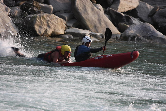 Ytterligare två timmars rafting efter lunch och inga större problem förutom i sista forsen. Vi fastnade på en stor sten och vattnet vällde in i raften och kilade fast den ordentligt. Vi firades till land med rep för att kunna hjälpa till med att försöka dra loss raften med rep. Vi höll på i två timmar, men förgäves. Raften satt fortfarande fast. Vi var tvungna att ta oss över älven till vår minibus. Strömmen var för stark för att simma så vi fick skjuts (ligga bak på en kajak och sparka med fötterna för att få fart) av en kajak över älven.