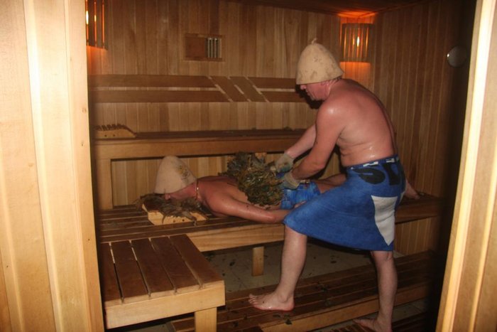 Vår värd, Vladimir, tog bra hand om oss. Vi var inbjudna till en minnesvärd kväll med bastu, mat och musik. Rysk bastu är något helt annurlunda: 10 minuters uppvärmning med olika doftessenser, dricka te, mer bastu med special behandling av lövruskor, dopp i iskall pool, 5 minuters bastu, dusch och mer te.