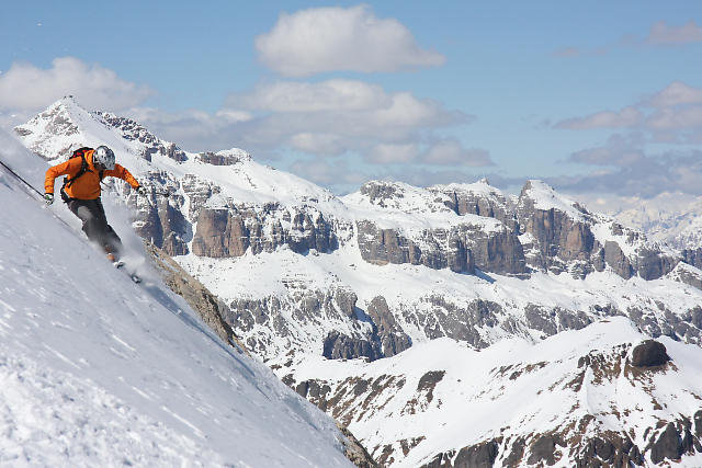 Arabba är en mysig liten by och ett bra ställe att bo på är Hotel Marilena – Fernando är en cool kille. Testa också Mickey’s Grill, bra mat och atmosfär. I Arabba, ta gondolen up till Porta Vescovo. Därifrån har du en hel del bra branta åk tillbak ner mot Arabba. När du tröttnat på Arabba, droppar du ner på andra sidan berget till Malga Ciapela (1446m) och tar de tre gondolerna upp till Marmolada glaciären (3342 m). Därifrån finns det ett antal långa, branta, öppna åk ned till Passo Fedala (2057 m). Loopa runt en gång till i Marmolada eller droppa tillbaka till Arabba och ta en espresso och en grappa.