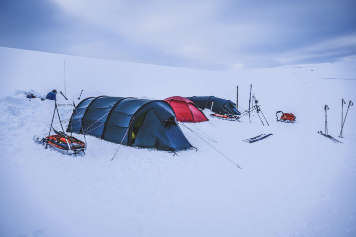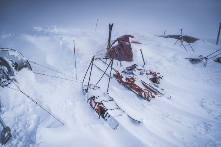 Med all förberedelse i världen är det dock svårt att förutse hur mycket det kan dreva… det dreva så mycket att det blev en meme. ”Vi måste skotta IGEN”. – ”Drevar du??” Tredje natten var vi uppe varannan timme för att inte tälten bokstavligen skulle försvinna under snön. Det var helt orimligt. Den djupa toaletten och köket vi hade grävt ut var historia efter bara timmar.