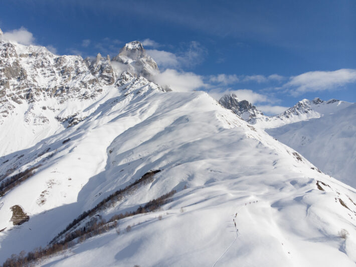 På andra sidan dalen från hotellet utmärker sig berget Ushba med sina branta klippväggar och sin ståtliga höjd på 4710 meter. Det är känt hela Georgien och ett populärt berg för alpin klättring. Precis söder om Ushba ligger ett stort område med vita toppar och i stort sett obegränsad terräng för toppturande. Mellan alla vita toppar ligger Golpasset, och det är målet för resans sista skiddag.