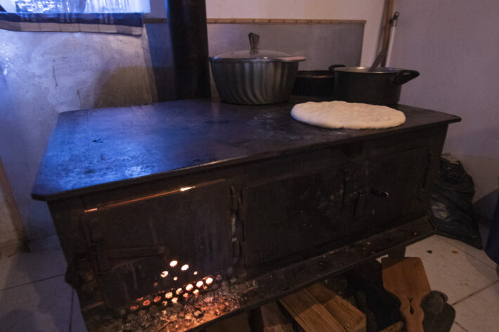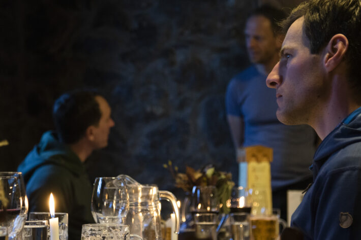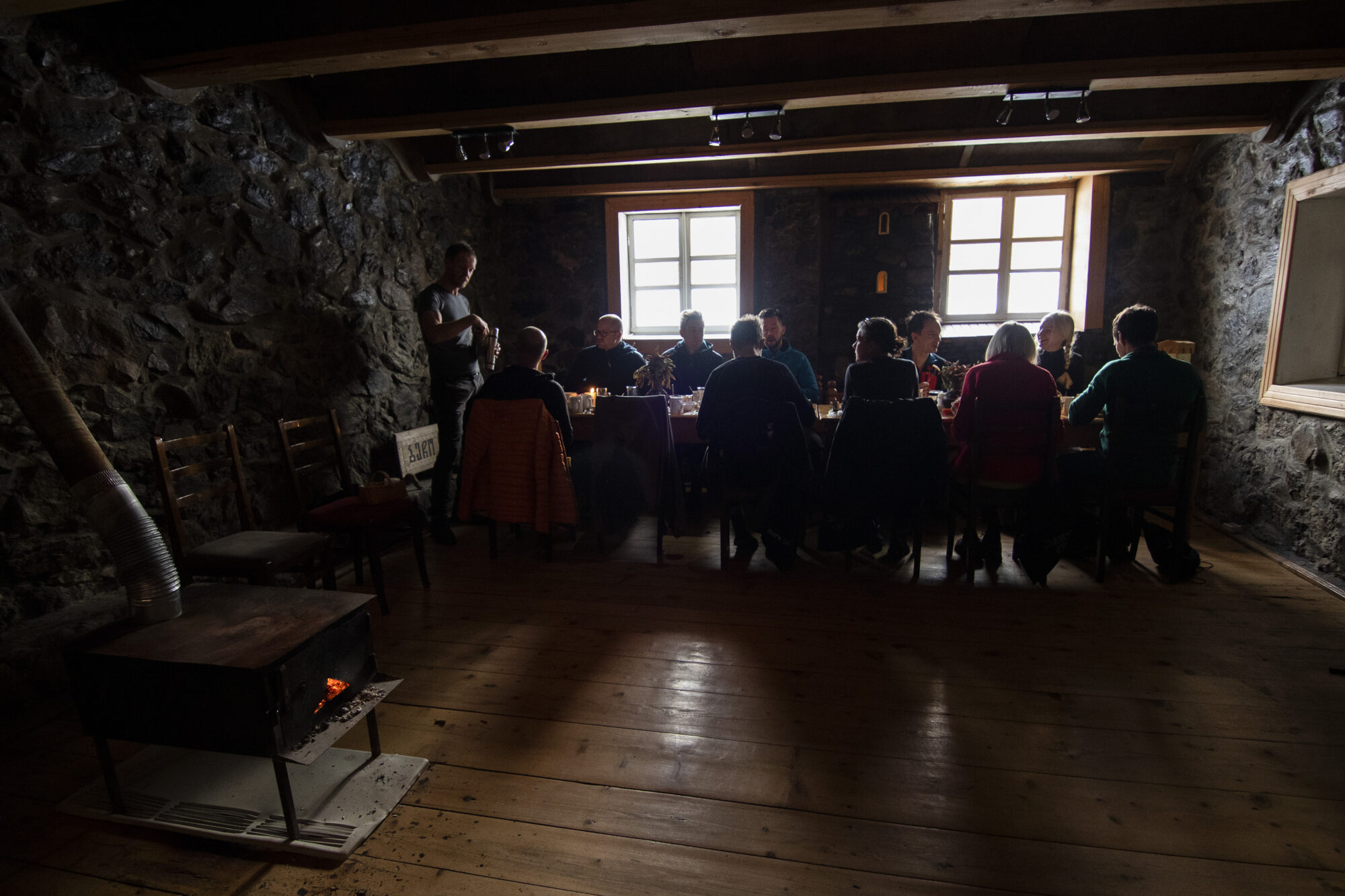 Frukosten serveras i huvudbyggnaden, den ena av totalt två. Gruppen sitter längs ett långt och rustikt träbord omgiven av vackert stenlagda väggar. I mitten av rummet ger en kamin värme till rummet. Pannkakor, gröt, youghurt och lokal äggröra gör våra kroppar redo för en lång dag på berget. Gruppens guide Oskar tar ordet och berättar att dagens plan är skidåkning på Solberget, som för en knapp timme sedan brann i rött.