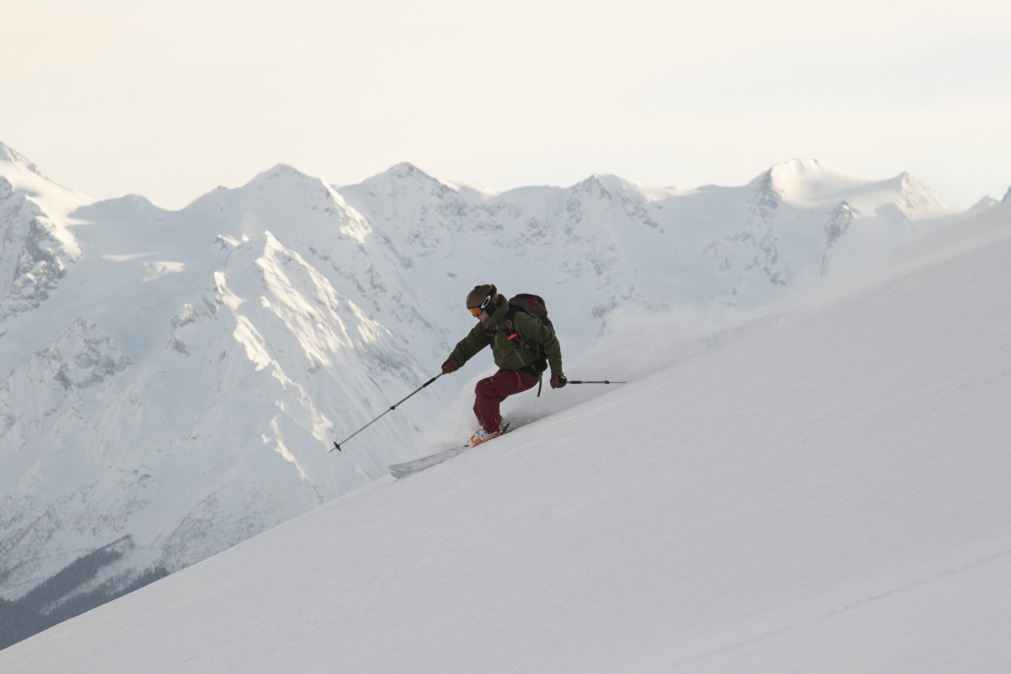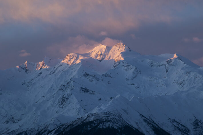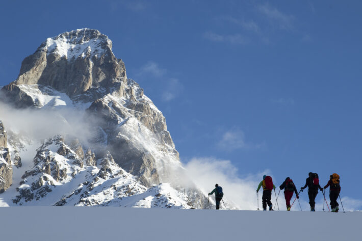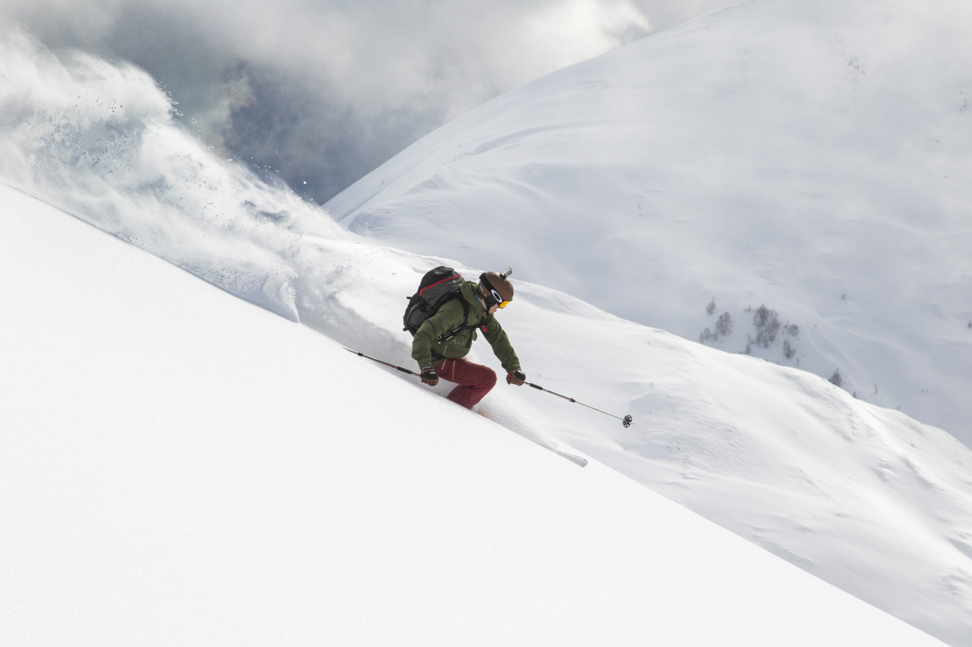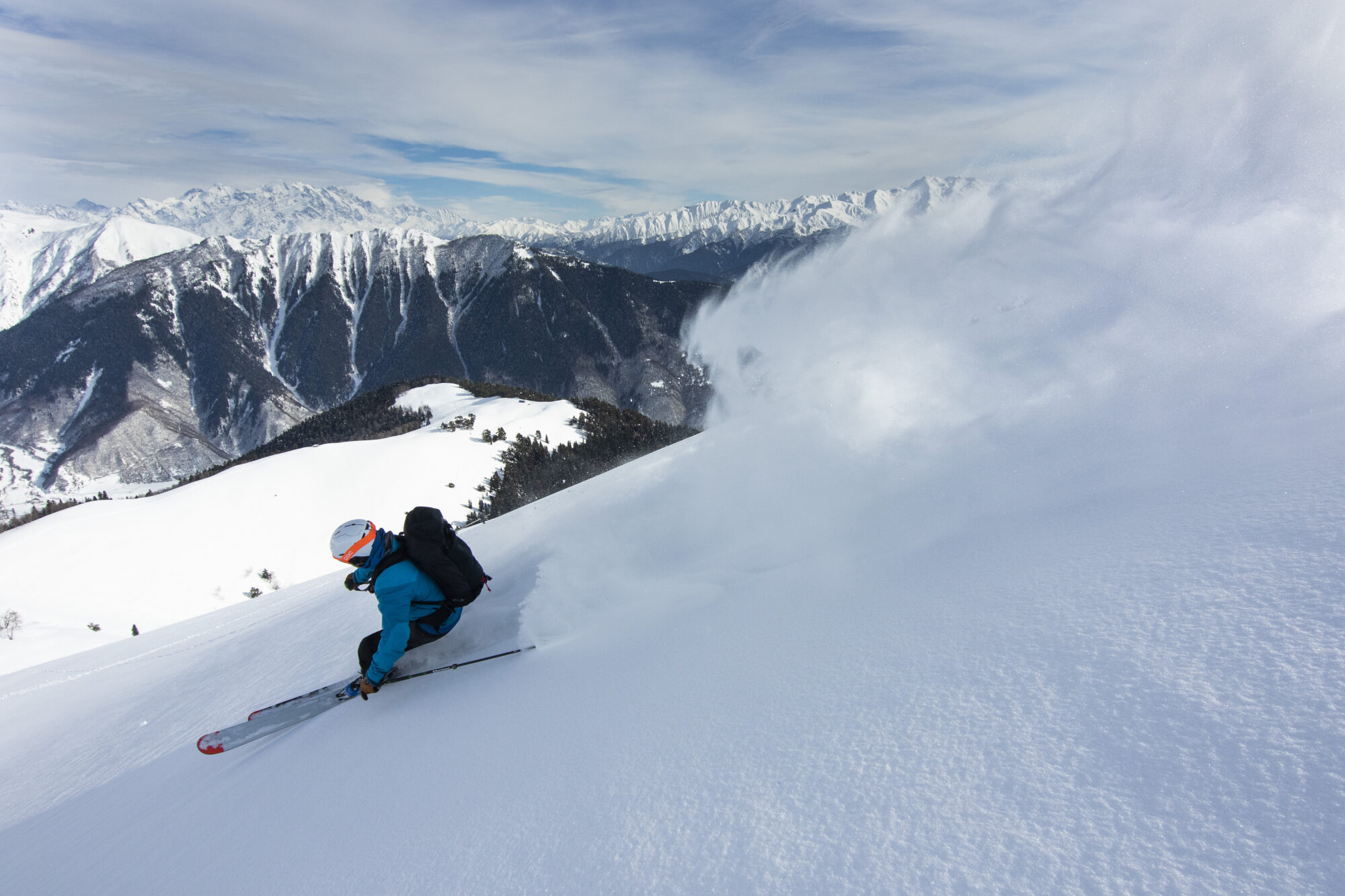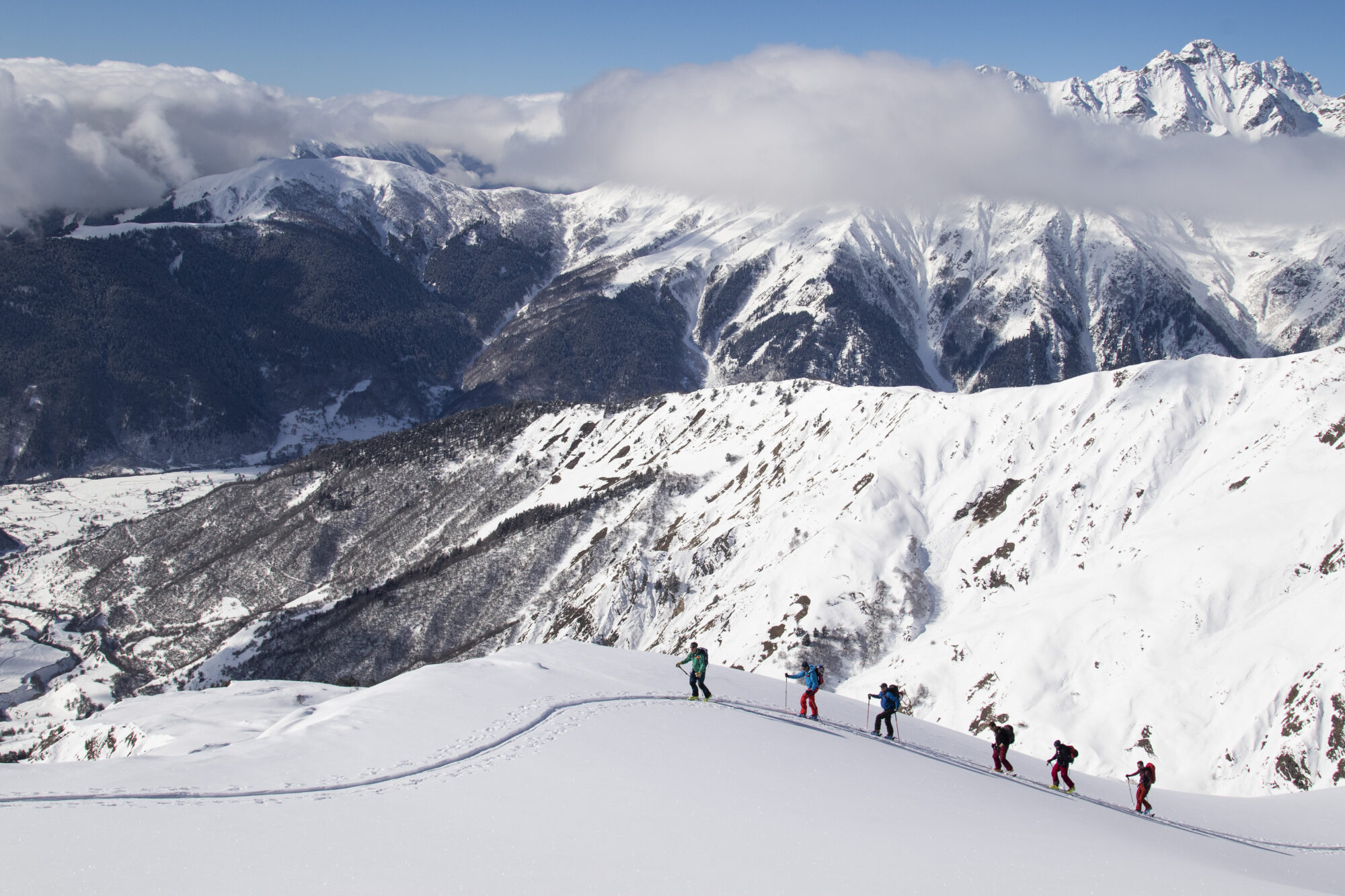 Utsikten är makalöst vacker. Bredvid oss ser vi hur Ushbas dubbeltoppar reser sig upp mot himlen. Molnen leker över landskapet och i horisonten österut ligger berget Gistola med dess mäktiga glaciärer. Efter energipåfyllnad dras stighudarna av och skidspetsarna pekas neråt. Under oss ligger kilometer och tonvis med orörd lössnö. Ett perfekt sista åk.