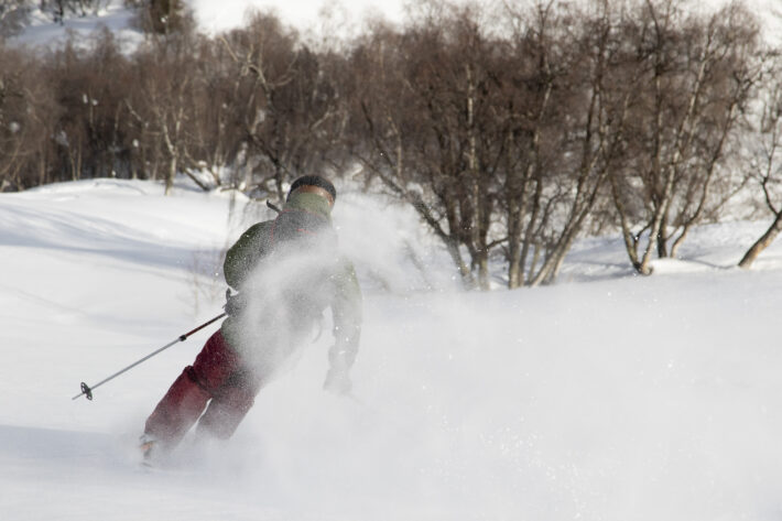Toppturen fortsätter över ett plattare parti innan sista branten upp till toppen av Solberget på 2557 meter över havet. Hotellets hund Bobby har följt med oss hela vägen och lägger sig på en snöfri plätt bredvid toppkorset. Valmöjligheterna nerför är vanligtvis många. Men inte idag. Den varma solen och de kalla nätterna har effektivt arbetat tillsammans de senaste dagarna. Hela berget är insvept i ett skarlager. Förutom nordostsidorna. Där ligger det puder. Och det är där vi åker skidor, hela vägen ner till trädgränsen.