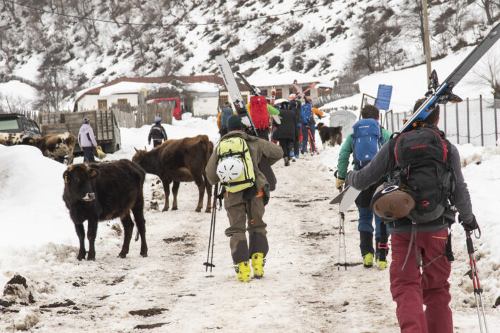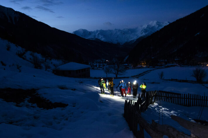 Med ljuset från pannlampor och ljudet från släpande stighudar rör sig gruppen från hotellet genom byn Mazeri och in i dalen som leder upp mot passet. Längs vägen genom byn lunkar kossor och hästar fritt omkring samtidigt som hundar hoppar och skäller. Det känns spännande, äventyrligt och exotiskt. Solens morgonstrålar eldar på östsidorna i det mäktiga Svanetiska massivet bakom oss.