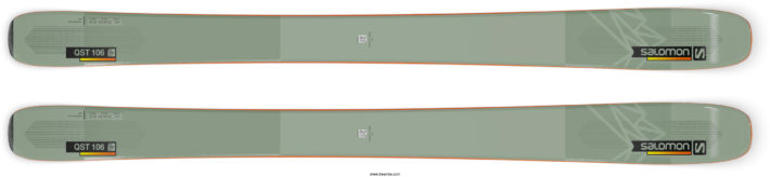 Salomons beskrivning: Du kan alltid lita på QST 106:an, oavsett underlag och väderförhållanden – dag in och dag ut. Denna friåkningsskida har en praktisk midja på 106 mm och en dämpande kolfiberkonstruktion. Rocker i spets och bakre del underlättar snabba, skarpa svängar medan den klassiska konstruktionen ger stabilitet och kraft även för fart och större svängar. QST 106 har en lätt poppelträkärna som ger prestanda och detta är en skida som fungerar bra som one quiver med en modern hybridbindning som Shift på. C/FX är ett fiberskikt i kolfiber och lin som vävts samman i skidan. Det kombinerar kolfiberns styrka, stabilitet och låga vikt med linets utmärkta stötdämpning. För att ytterligare dämpa skidan är det kork i konstruktionen, och just kork är tre gånger mer absorberande än Koroyd. Genom att använda det i skidspetsen möjliggörs en hög nivå av vibrationsabsorption och dämpning med ännu mindre vikt. Ett titanalinlägg under foten, från kant till kant genom hela skidan, för maximal kraftöverföring och ökat kantgrepp på hård snö. En fiberförstärkning direkt på kanternas yta ger ökad hållbarhet, kantgrepp och stöttålighet. QST har också ett skydd baktill för ökad hållbarhet: för att hålla skidorna snygga även efter intensiv användning.