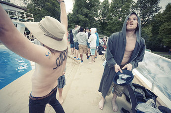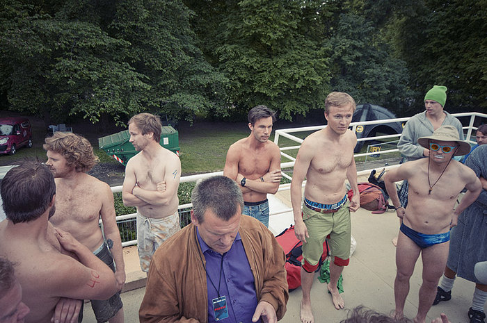 Adam Widén till höger i bild med den svenska landslagsdräkten: speedos och hatt