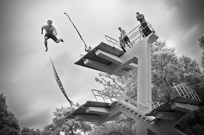 Den spektakulära grenen ”döds” dök upp på 60-talet på Frognerbadet i Oslo. Ett gäng herrar kom på att de skulle se vem som kunde ligga utsträckta så länge som möjligt i luften, gå för magplask men vika ihop kroppen likt en räka i sista sekund.