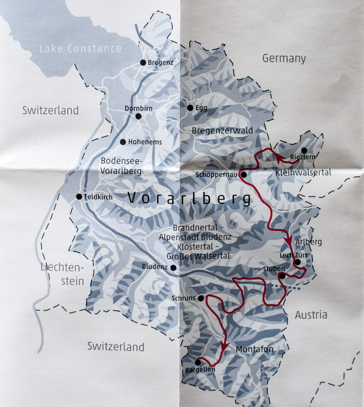 Upplockade i transfern som tar oss från ett grått Zürich vidare in mot ännu gråare berg sitter vi tillsammans. Jag och tre nya ansikten jag aldrig har sett förut. Vi har fått varsitt magasin från Vorarlbergs turistbyrå och i den finner jag en artikel om turen som jag själv ska få uppleva, ”Skiride Vorarlberg”. Magiska förhållanden, grym snö och en avslappnad känsla målas upp i texten. Skribenten verkar ovanligt förtjust i guiden Helmut ”Heli” Düringer som tar gästerna på turen. Heli, som bergsguide alltså kallas, beskrivs som vänlig och snäll, framförallt någon man känner sig trygg med på berget. Uppväxt i Vorarlberg är han också.