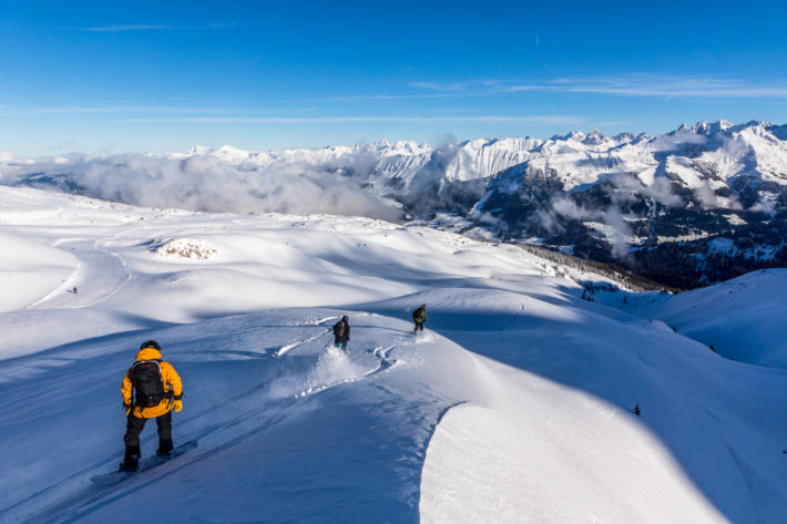 Efter många åk i liftnära offpist är det till slut dags för att spänna på hudarna en sista gång för att ta oss till en topp som gränsar ner mot grannlandet Schweiz.