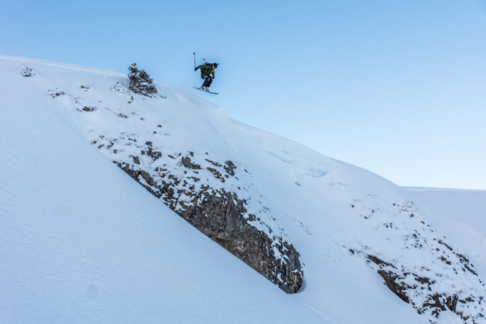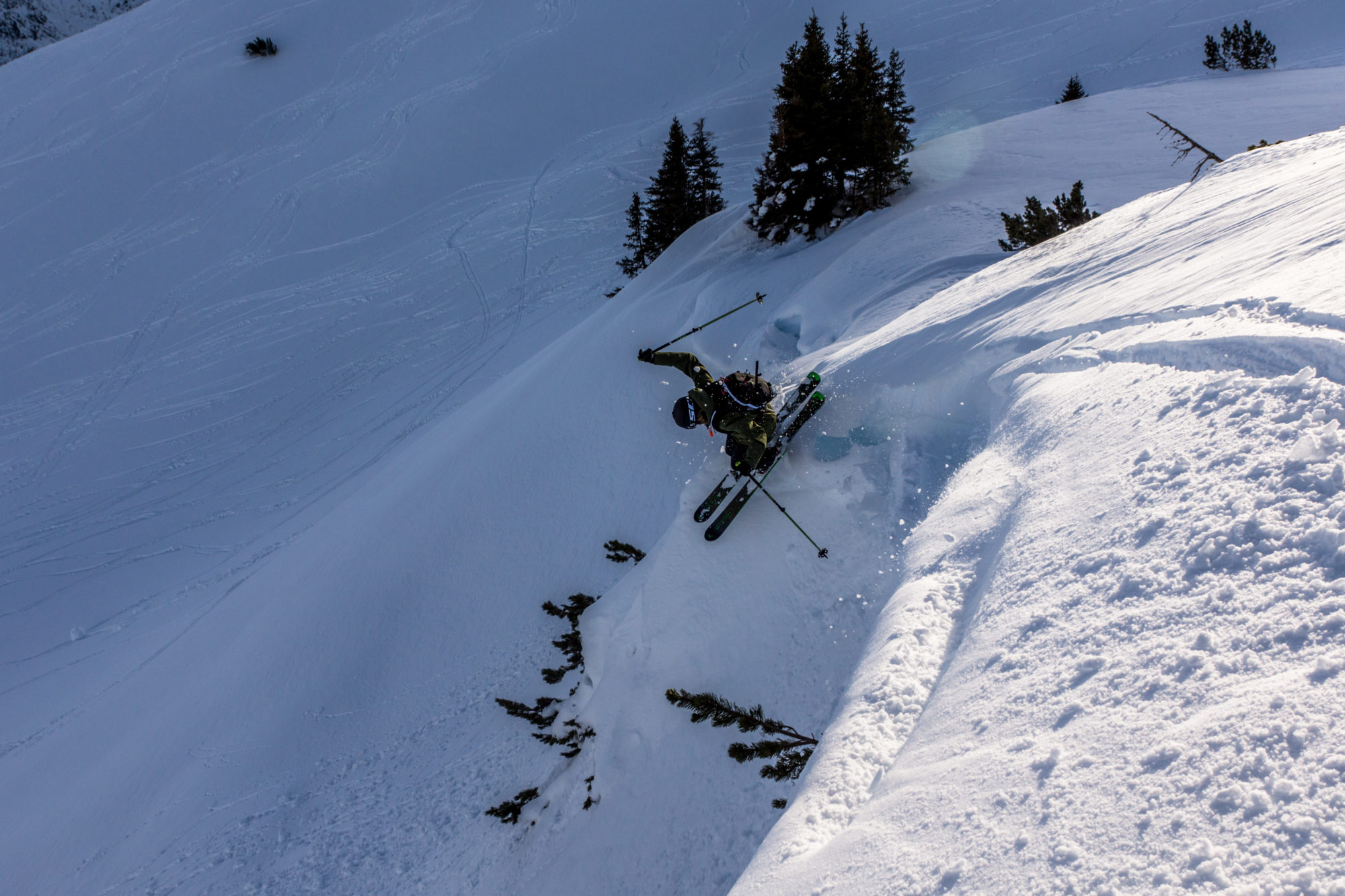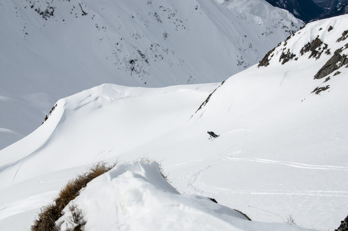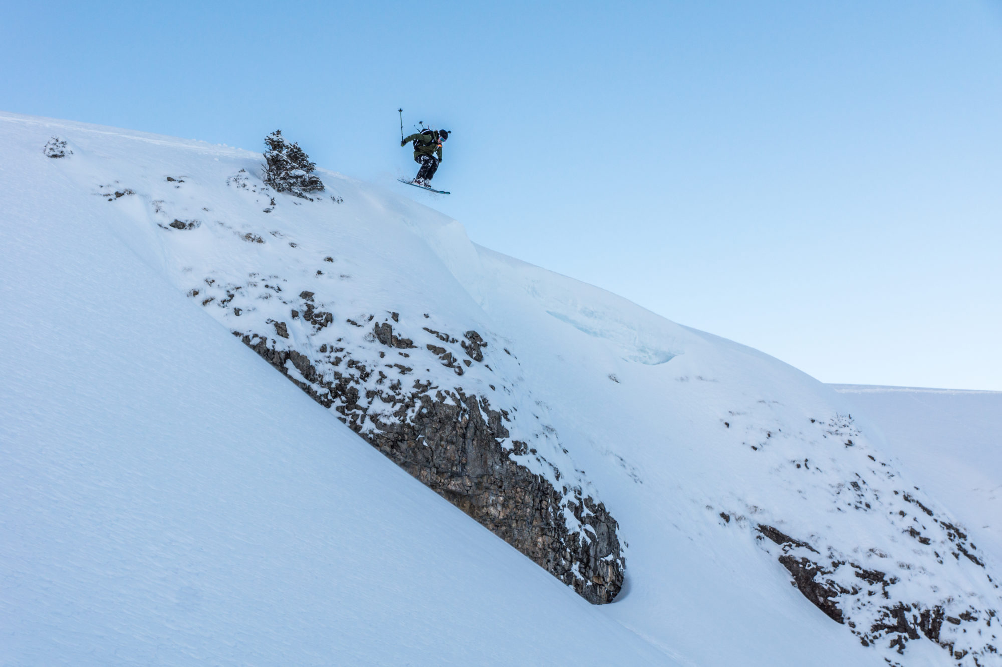 Vädret är bra och snön är bättre. Kanske bäst hittills. Veckan har ju som tidigare nämnt bjudit på lite tungstyrd snö då plusgraderna letat sig upp precis efter det massiva dumpet kom och mer eller mindre besudlade det fina pudret. Heli pekar ut en linje som han tror passar mig, en brant som går ner i en ränna följt av en klippa. Pang bom smack the lip och rätt som det är står jag på botten av åket skrikandes av eufori. De andra tar sig ned en bit för att köra en lugnare variant och det ger mig utrymme till att ta några schyssta bilder. Stoke-nivån är hög i gänget och vi fortsätter dagen med ett leende på läpparna.