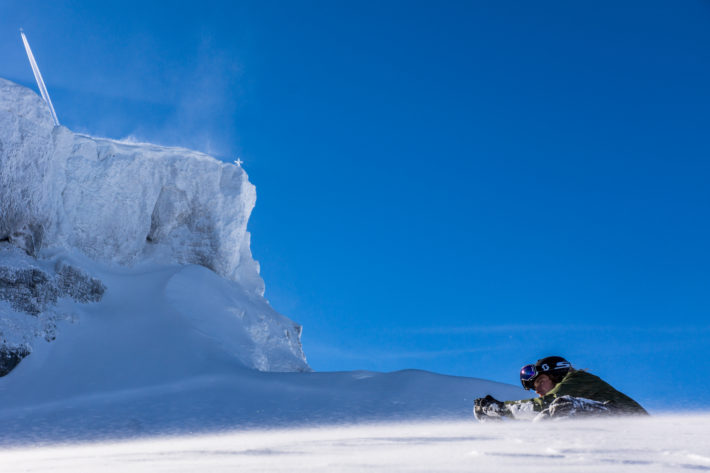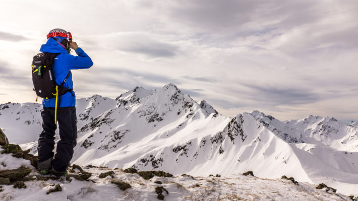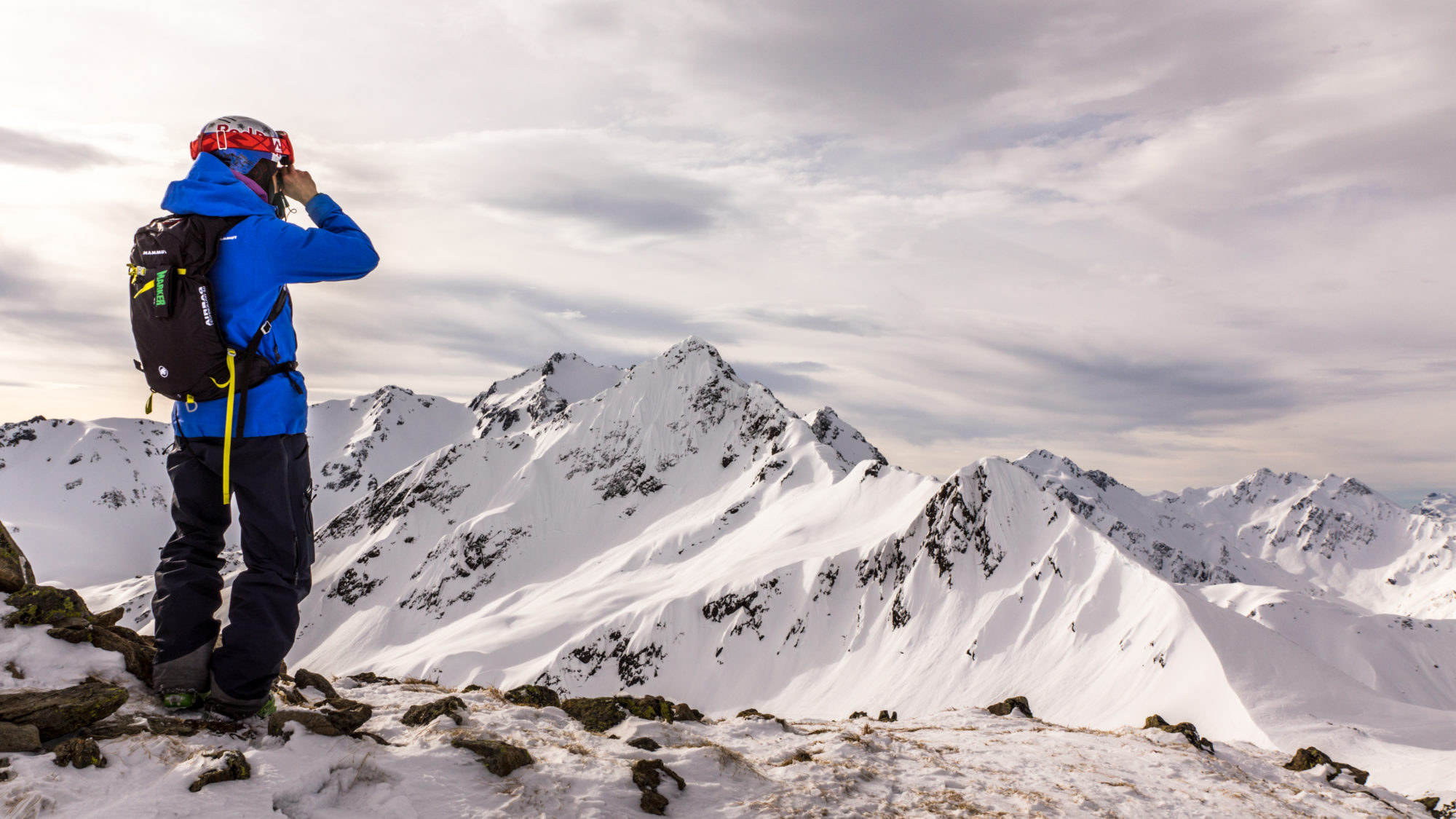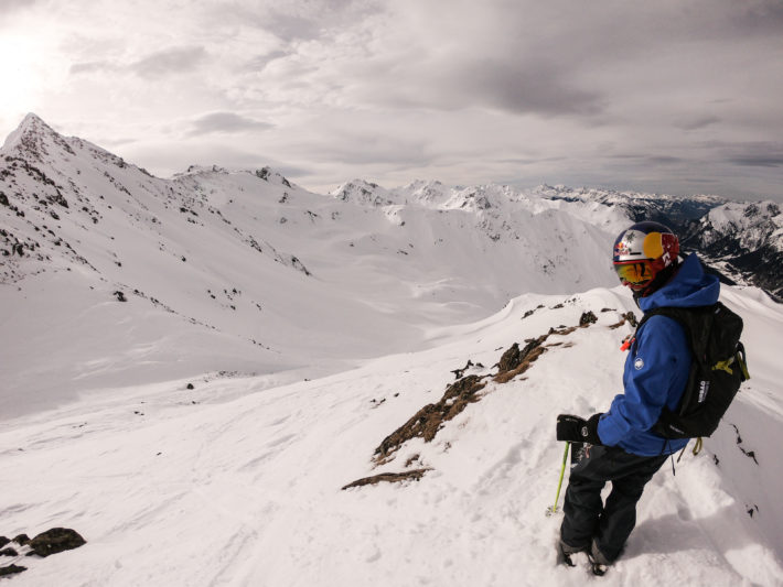 På Mairoköpfes topp, 2 522m, står Nadine med kikaren och spanar linjer på de massiva bergsväggarna. Lokala guider och bybor som njuter av sin lediga dag hojtar till när de ser tjejen med Red Bull-hjälmen ståendes på kammen. Här känner alla varandra och de som är uppväxta i området tenderar att stanna kvar livet ut. Förväntan på åket ner är högt från min sida, Nadine och Heli är däremot lite mer tveksamma. Värmen som tidigare nämnts har klättrat högt upp i dalen och vandaliserat pudret som föll för en vecka sedan.